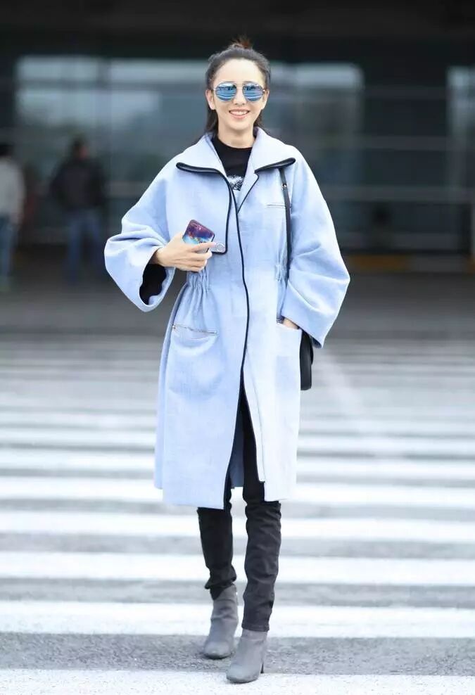 佟丽娅戴着蓝色镜面墨镜,身穿Dior 2017早春系列淡蓝色褶皱翻领拉链大衣,肩背Celine Trotteur黑色金属扣手袋,下穿黑色紧身牛仔裤,脚踩深灰色麂皮粗跟踝靴。