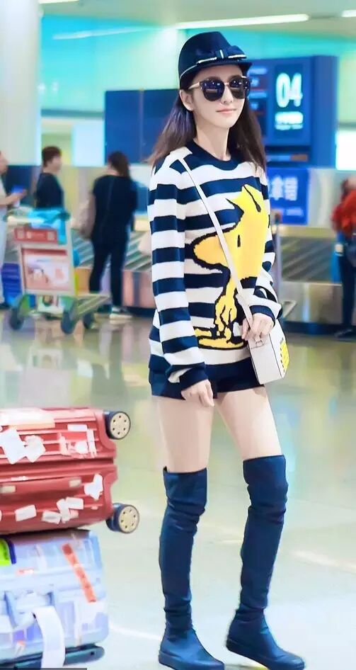佟丽娅身穿Gucci 2016秋冬系列黑白条纹卡通印花毛衣,头戴黑色礼帽,肩背Anya Hindmarch白色手袋,下搭黑色短裤,脚踩黑色平底过膝靴。