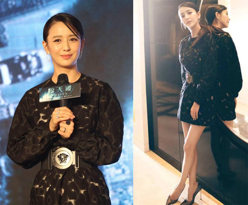 佟丽娅身穿Versace黑色印花长袖连身裙,腰间系Versace黑色金属腰带,脚踩黑色亮面尖头高跟鞋。