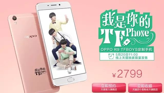 之前我们曾经报道过TFBOYS定制机的消息,现在TFBOYS定制机终于到来,并命名为TFphone。该机由OPPO R9定制而来,配置方面和OPPO R9没有太大的区别,依旧是5.5英寸的屏幕,1600万像素的前置镜头,VOOC闪充功能等等。该机的售价为2799元,将于5月20日在天猫旗舰店进行发售。