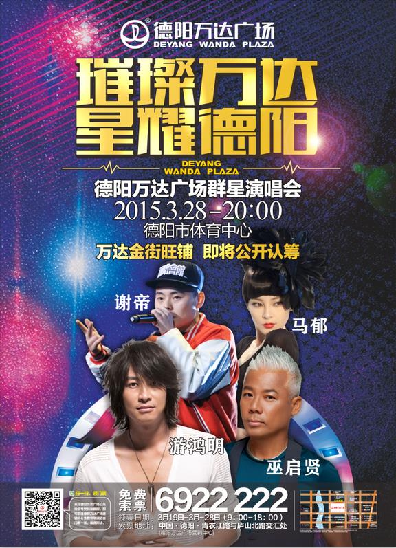 “璀璨万达 星耀德阳”---3月28日20:00德阳万达广场斥巨资打造的群星演唱会即将在德阳市体育中心震撼上演,引爆德阳最强音!华语乐坛“情歌圣手”游鸿明、“多面歌神”巫启贤、《中国好歌曲》新秀谢帝、华语柔情女歌手马郁…众多华语巨星空降德阳为万达而来!