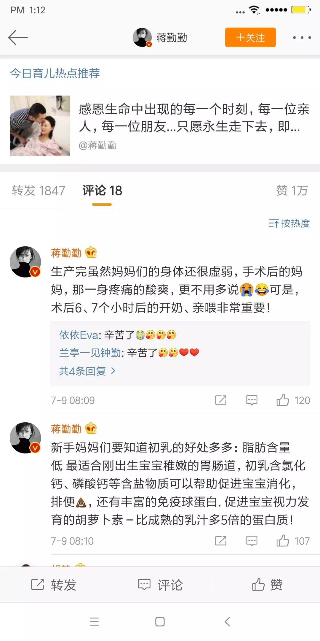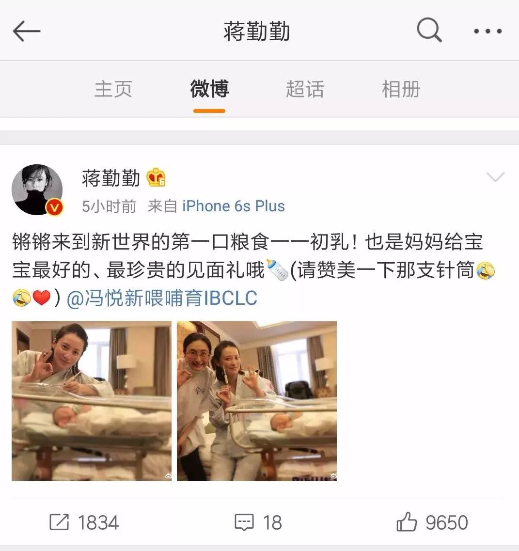 今天,蒋勤勤在微博上告诉了大家宝宝的名字,并且说:锵锵来到新世界的第一口粮食——初乳,也是妈妈给宝宝最好的、最珍贵的见面礼(仔细观察下上面一张图的第四张,你会发现锵锵也是晚断脐哦)。现在越来越多的明星知道了母乳喂养的重要性和好处,很多明星也越来越重视母乳喂养。