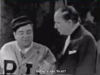 这句台词出自一段非常搞笑的关于棒球的对话(很像中国的相声)。两个人在一起谈论某棒球队,而球员的名字非常特别,一垒手叫“Who”,其他球员分别叫“What”、“Idon't know”、“Why”、“Because”、“Tomorrow”、“Today”、“Idon't give a darn.”于是产生了许多笑料。在纽约古柏镇的美国国家棒球名人堂博物馆里,有个角落放着一台电视机,专门为游客反复播放这段搞笑对话。印有这些搞笑的球员名字的T恤和球衣也非常流行。