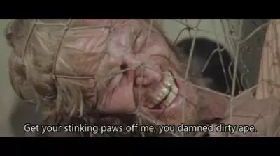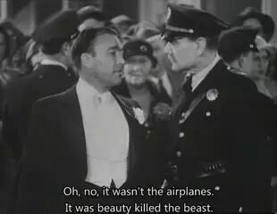 这是影片的最后一句台词。看着从帝国大厦顶上掉落的金刚的尸体,疯狂的导演作出了这个经典评论。在彼得.杰克逊重拍的版本中也保留了这句台词。