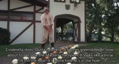 “灰姑娘的故事,突如其来。从前的高尔夫球场管理员,现在即将成为大师赛冠军。简直是个奇...球进洞了!球进洞了!球进洞了!”