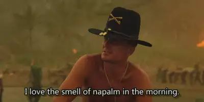 中校下令用飞机投掷汽油弹烧掉森林,只是为了压制越共的火力让他冲浪。说这句话的时候,他正悠闲地坐在枪林弹雨的战场上。