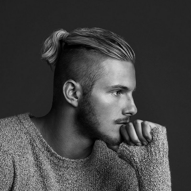 可以说这款发型是属于不剃鬓角的丸子头( Man Bun )与铲车头( Under Cut )的结合。鬓角与后脑的超短长度保证了头部的散热。
