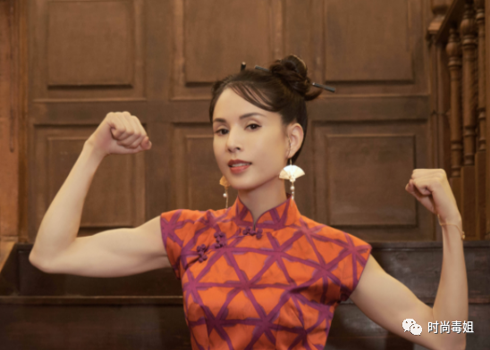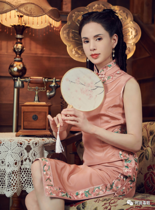 李若彤穿了一身粉色的旗袍,很多人到了一定的年龄段之后都会忌讳穿粉色,主要是因为粉色在视觉上会呈现出非常减龄的感觉,少女感十足,不过对于稍微年长一些的女性们来讲,在搭配的时候粉色很可能呈现出过于装嫩的感觉,想要避免装嫩的话,在色彩的饱和度上一定要低一些,用适当浅淡的色彩饱和度来呈现出清爽且甜美的感觉。