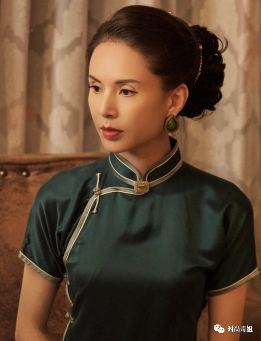 相对于浅淡甜美的粉色旗袍来讲,适当厚重的深绿色或者是墨绿色旗袍在视觉上呈现出来的感觉会更加稳重,这种墨绿色比较不好驾驭,对于年轻的小女生们来讲会显得有些厚重,容易穿出老气感,其次这种色彩对于肤色的要求也会偏高,肤色不够白皙的话很难撑得起来。不过肤色白皙身材又好的李若彤穿起来却显得十分轻松,不显老反而显得十分高级。