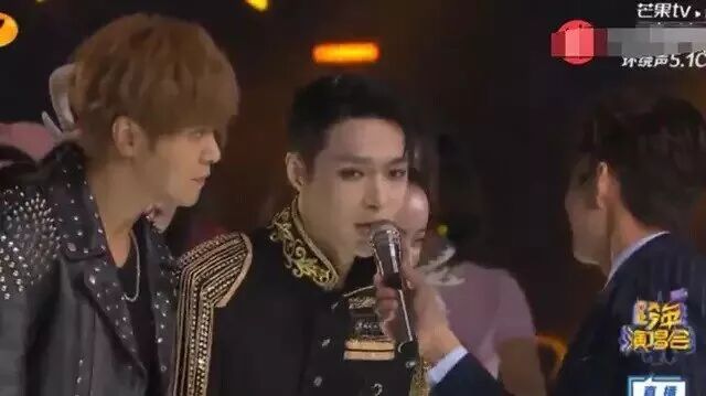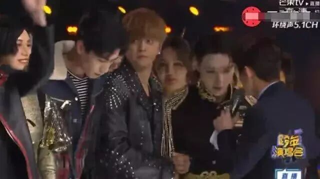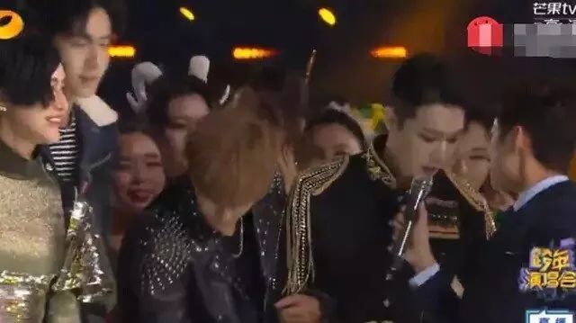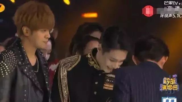 何炅看张艺兴站的位置太靠边,就想把他拉到中间一点。但暖心的张艺兴一直盯着何炅的脚底下。因为张艺兴正好站在T形舞台的拐角处,何炅背后就是舞台边沿了。