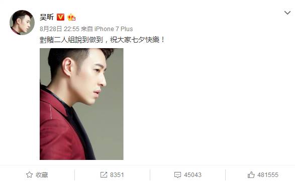 三分钟之后吴昕也发同样的内容,配图是潘玮柏,也换成了自己的头像。