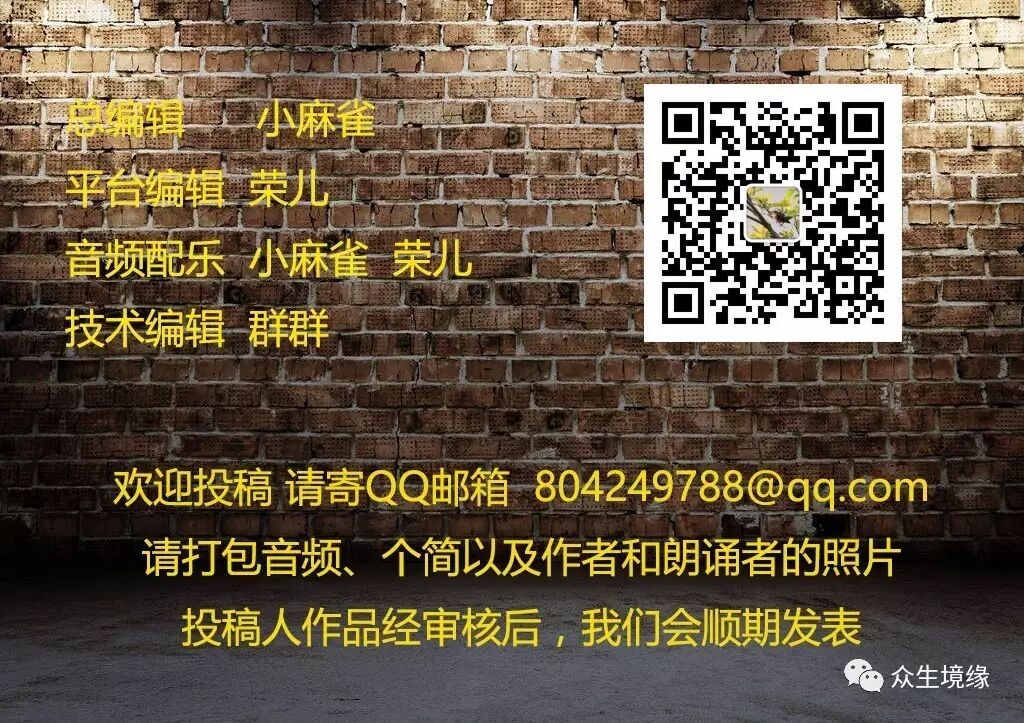 朗诵:芳草,师从中央电视台原主播薛飞先生学习朗诵。酷爱朗诵艺术,喜爱抒情,哲理的朗诵素材。追求自然,流畅的表达方式