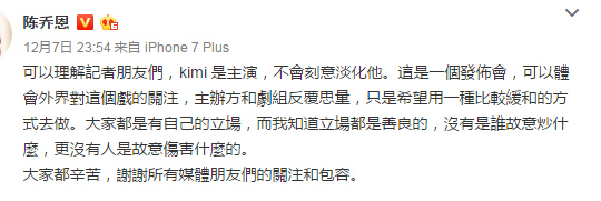 可以理解记者朋友们,kimi 是主演,不会刻意淡化他。这是一个发布会,可以体会外界对这个戏的关注,主办方和剧组反复思量,只是希望用一种比较缓和的方式去做。大家都是有自己的立场,而我知道立场都是善良的,没有是谁故意炒什么,更没有人是故意伤害什么的。