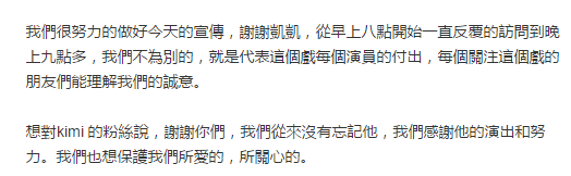 想对kimi 的粉丝说,谢谢你们,我们从来没有忘记他,我们感谢他的演出和努力。我们也想保护我们所爱的,所关心的。