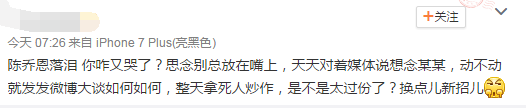 陈乔恩落泪 你咋又哭了?思念别总放在嘴上,天天对着媒体说想念某某,动不动就发发微博大谈如何如何,整天拿死人炒作,是不是太过份了?换点儿新招儿。