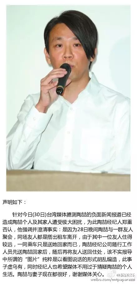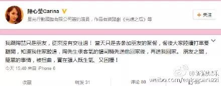 28日晚陶喆被拍到和艺人陈心莹吃饭,之后再同车离开,该女子也被曝是陶喆前女友。记者致电陶喆经纪人,对方称:“她并非陶喆前女友,只是朋友”,随后也发声明称“陶喆与妻子现在都很好。”陈心莹下午也发微博:只是朋友,未交往过。