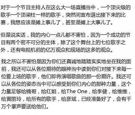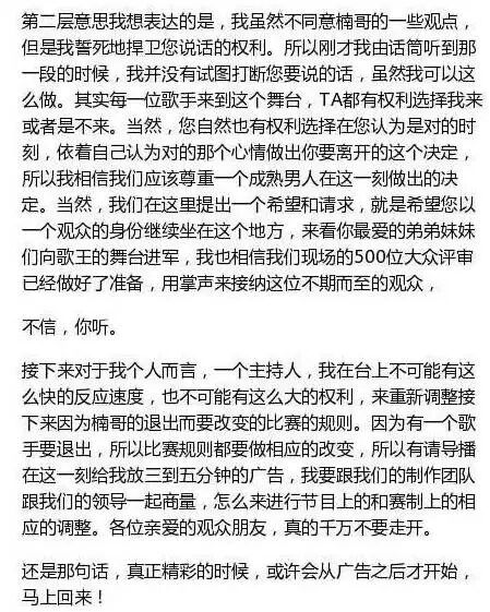 汪涵当时说自己是“摊上大事儿”了,在孙楠宣布退赛之后,汪涵说了一段话。短短一段话,立场站稳了,给观众交代了,给台里把责任划清了,给制作团队的窘况解围了。同时还有逻辑,有要点,所以汪涵的主持功力可见一斑。