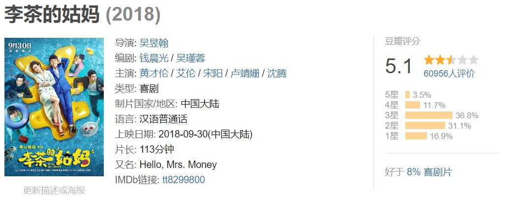 而备受关注的开心麻花第三部作品《李茶的姑妈》豆瓣评分竟然是: