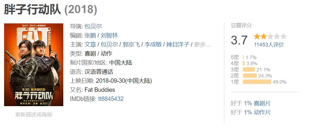 文章和包贝尔的动作喜剧《胖子行动队》得分是: