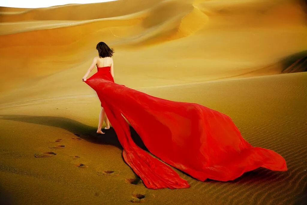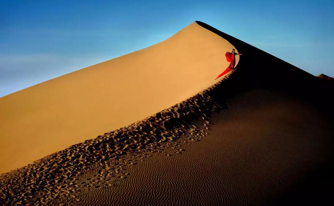 穿上色彩对比强烈的衣服,顺着风向都开裙摆,背后无边际的沙漠风光就是你最好的装饰。