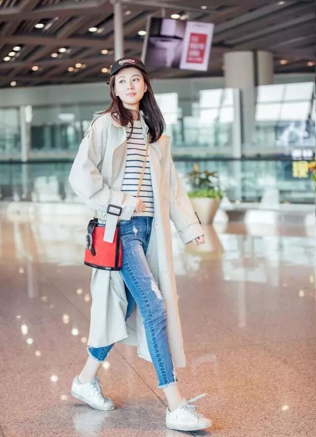 现身机场头戴棒球帽,身穿条纹打底衫外搭浅色外套,下搭浅色九分牛仔裤,脚踩一双休闲平底鞋,这样看起来满满的少女风。