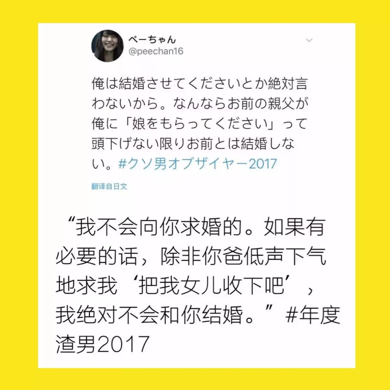最近在岛国推特上最热门的一个话题是——“2017年度渣男”,日本的姑娘们纷纷流着泪吐槽。一个又一个地看下来,只能说善良限制了我的想象。来,大家感受一下。