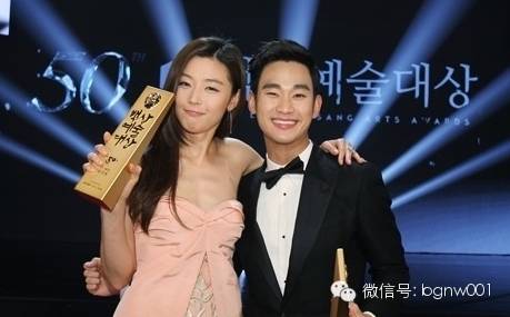 百想艺术大赏获奖的金秀贤和全智贤亲密合影,金秀贤的手并没有搭在全智贤的腰上,被赞很绅士。