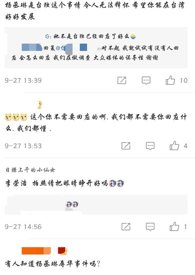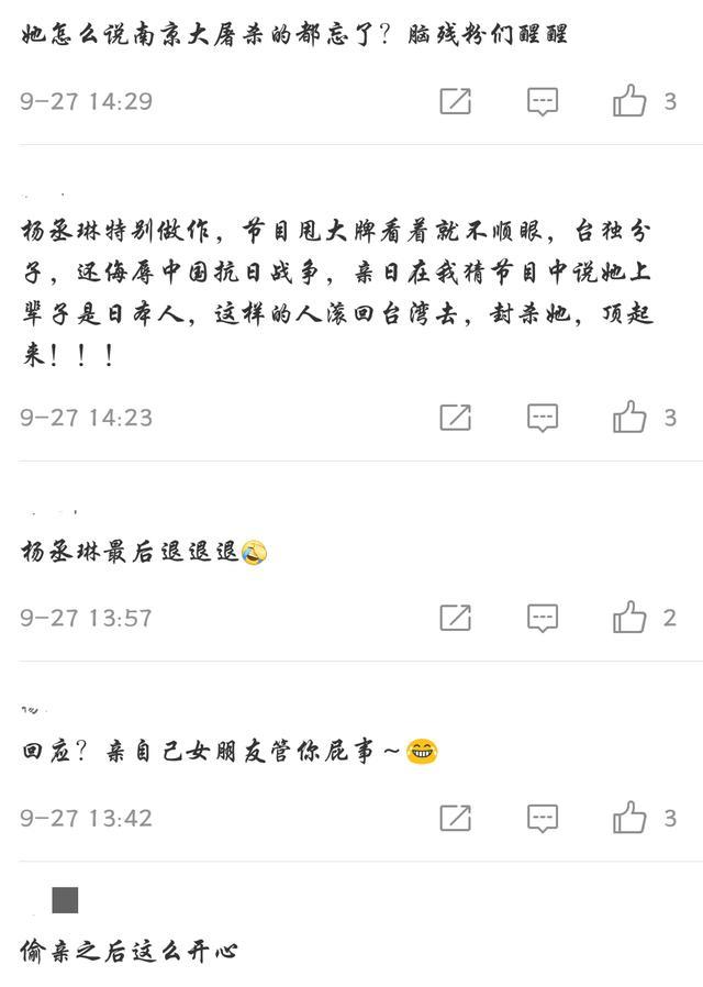 对此网友们纷纷表示祝福李荣浩和杨丞琳这对“真的很幸福了,祝福99”也有网友调侃李荣浩“眼睛虽然小,发起狗粮来一套一套的”虽然大多数的评论留言都是对二人送祝福的,但小编还是在评论里看见了“杨丞琳是台独这个事情 令人无法释怀 希望你能在台湾好好发展”而且还不止是一条这样的评论“杨丞琳特别做作,节目甩大牌看着就不顺眼,台独分子,还侮辱中国抗日战争,亲日在我猜节目中说她上辈子是日本人,这样的人滚回台湾去,封杀她,顶起来!”