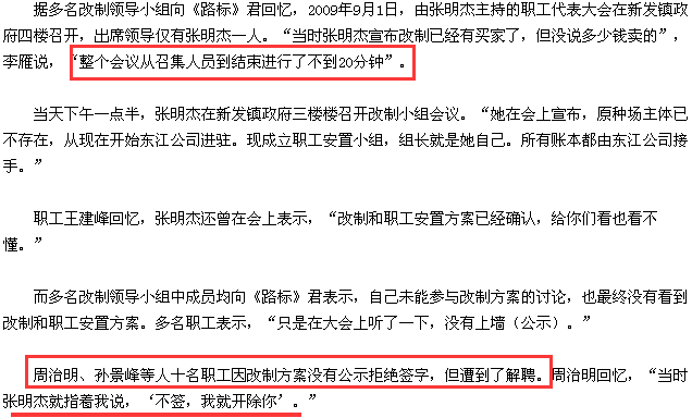 关于这件案子有很多小细节,改制组的职工因为没有看到改制方案,被张明杰直接解聘,说不签就开除他。几千万上亿的改制方案会也只简单的召开不到20分钟。