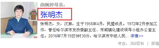 曲婉婷的妈妈叫张明杰,曾经是哈尔滨市发改委副主任,市城镇化建设领导小组办公室主任。