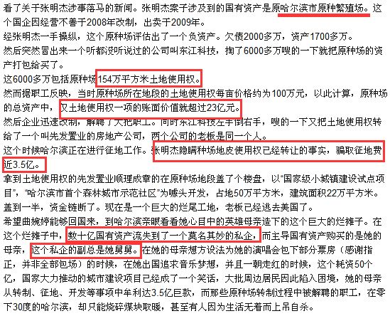 简单的说,就是张明杰曾经把哈尔滨的一个经营不善的154万平米的国企原种繁殖场,账面价值估值23亿,她以打包价6000万卖给一个注册资本只有50万的私人企业。