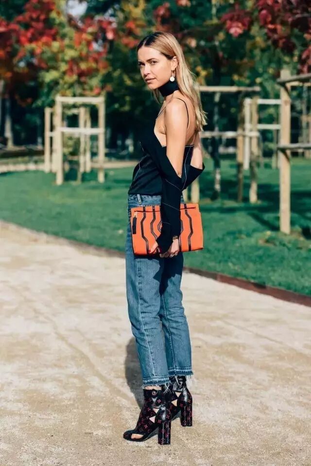 黑灰色的牛仔更是帅气十足,搭配高跟凉鞋和蕾丝上装,优雅知性融为一体。