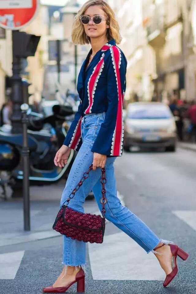 需要注意的是,任何点缀都是宜精不宜多,下图的流苏+拼色+彩色条纹就显得过于花哨了,没有重点的搭配虽然吸睛,却并不长存。