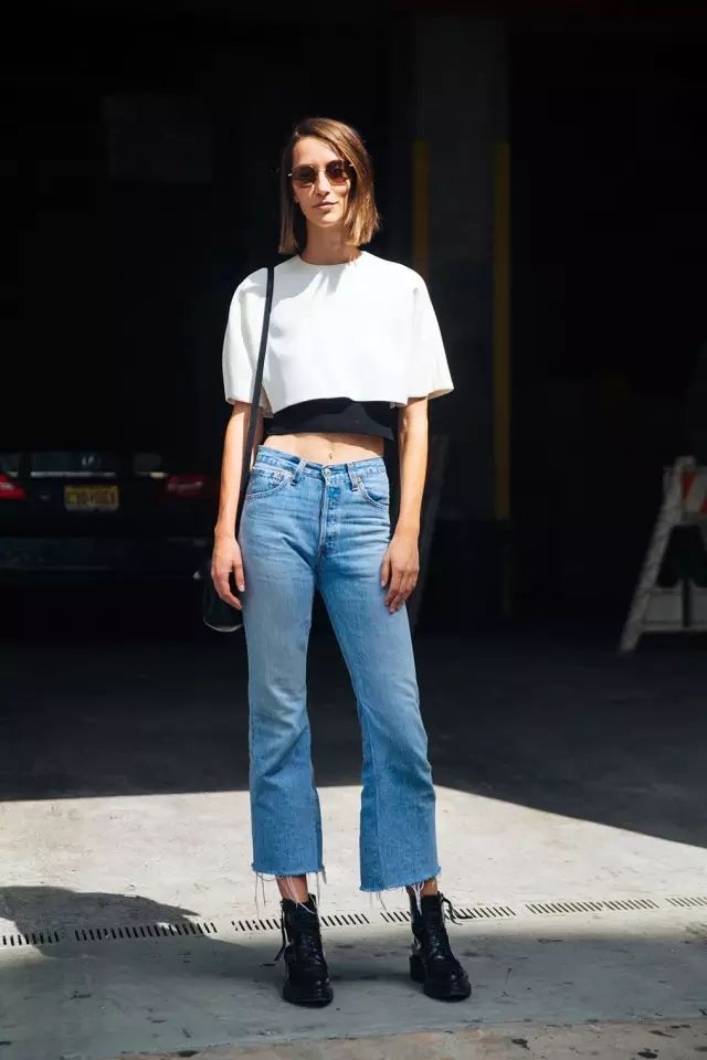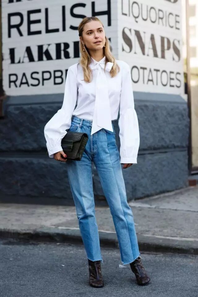 直筒撕边牛仔裤+短T短衬+平底鞋,自然而然的中性慵懒风呼之欲出,要显得更chic一定要记得塞衣角。