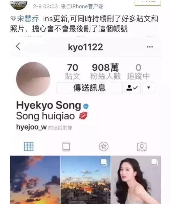 今年初,宋慧乔更换了ins头像,还删除了跟宋仲基的大部分照片,疑似感情出现裂痕。
