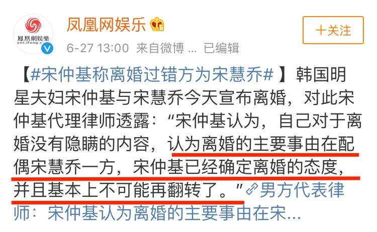 “宋仲基认为,离婚的主要事由在宋慧乔一方,已确定离婚的态度,基本上不可能再翻转。”