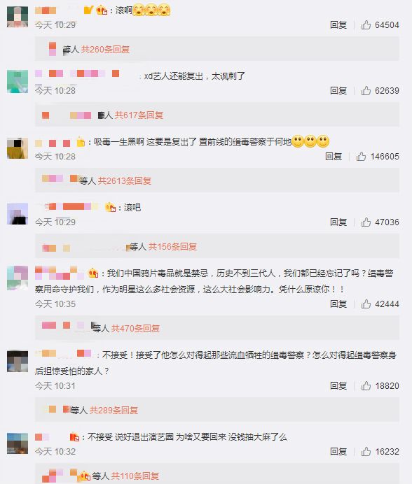 "Celebrities who took drugs should be permanently banned," said a netizen on Sina Weibo, noting that many anti-drug enforcers risk their lives to protect people from drugs.
