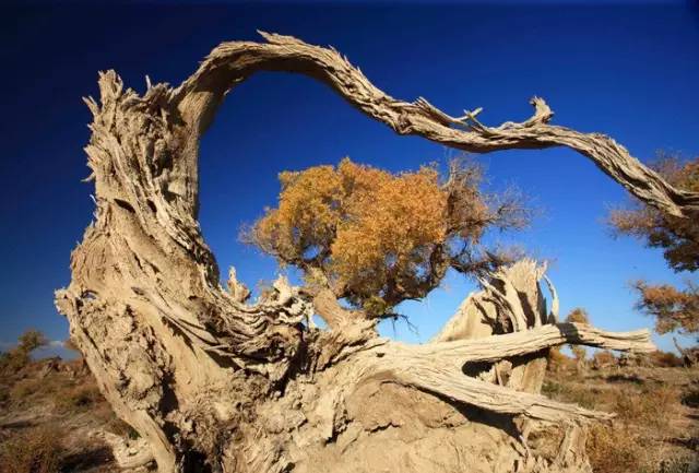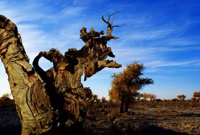 千百年来,它们以顽强的意志抗击着沙漠的侵蚀。让人惊叹的是,这些铁骨铮铮的树干,形状千姿百态,有的似鲲鹏展翅,有的象骏马扬蹄,还有的如纤纤少女。简直就是一座天然艺术宫殿。有诗写道:“矮如龙蛇数变形,蹲如熊虎踞高岗。嬉如神狐九尾,狞如夜叉牙爪张。”