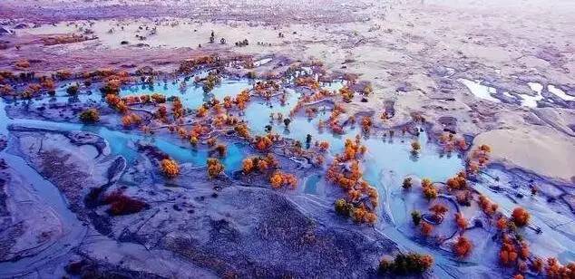 新疆轮台胡杨林是中国最美的十大森林之一,大面积的胡杨林与河流、沙漠、戈壁、绿洲、沙湖、古道及荒漠草原融为一体。
