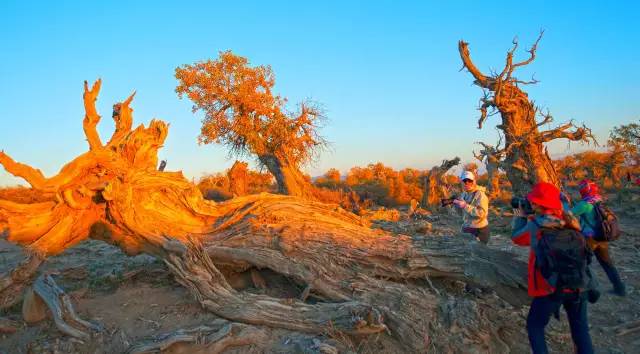 蔚蓝的天空,金黄茂密的树叶,干枯狰狞的树干,构成了一幅幅色彩对比鲜明,视觉冲击力极强的绝美画面。