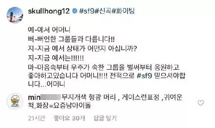 在粉丝评论都在大赞洪基sense精的同时,却有一位网友在评论下留言:“彩虹色的荧光头发,像gay一样的表情,装可爱,化妆=最近的男爱豆”,对SF9进行了人身攻击。