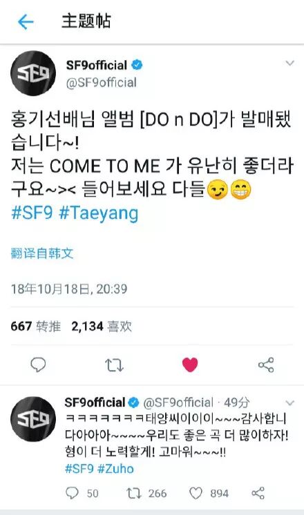 当然,作为后辈的SF9也对洪基的爱护给予了回报。去年洪基的solo专辑发售时,SF9也在twitter上给前辈宣传,成员朱豪更是亲自助阵,FNC的家族爱叔磕了!