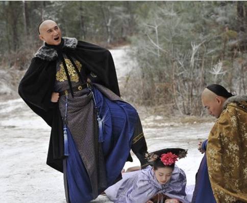 放大招了!这一张绝对是片场图里面最具代表性的了,看看皇阿玛销魂的帽子,三个人的军大衣,老佛爷捂手的方式绝对最佳片场图!