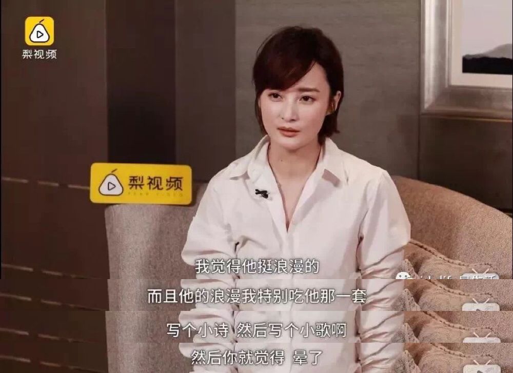 她曾在访谈节目里提到:“我觉得他挺浪漫的,而且他的浪漫我特别吃他那一套。写个小诗、写个小歌啊。”
