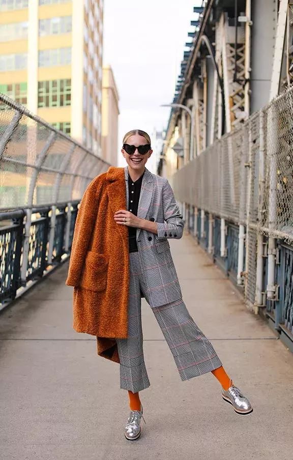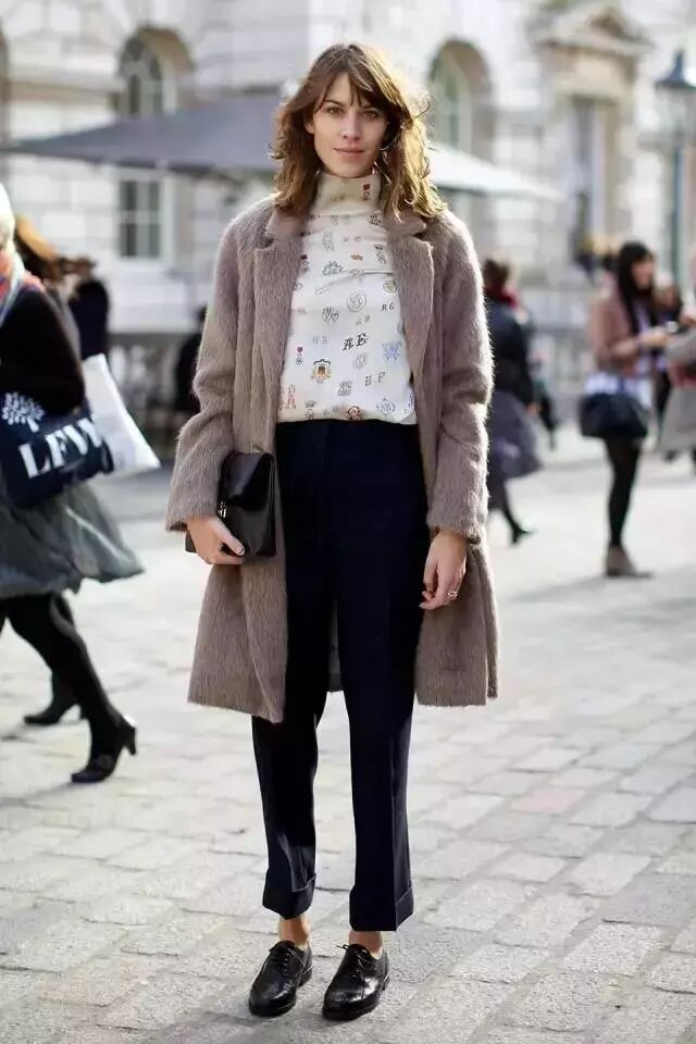 Alexa Chung 这身搭配可以说是很聪明了,用西装裤和牛津鞋的利落感来中和毛绒外套的柔美感,娘 man 平衡得恰到好处。