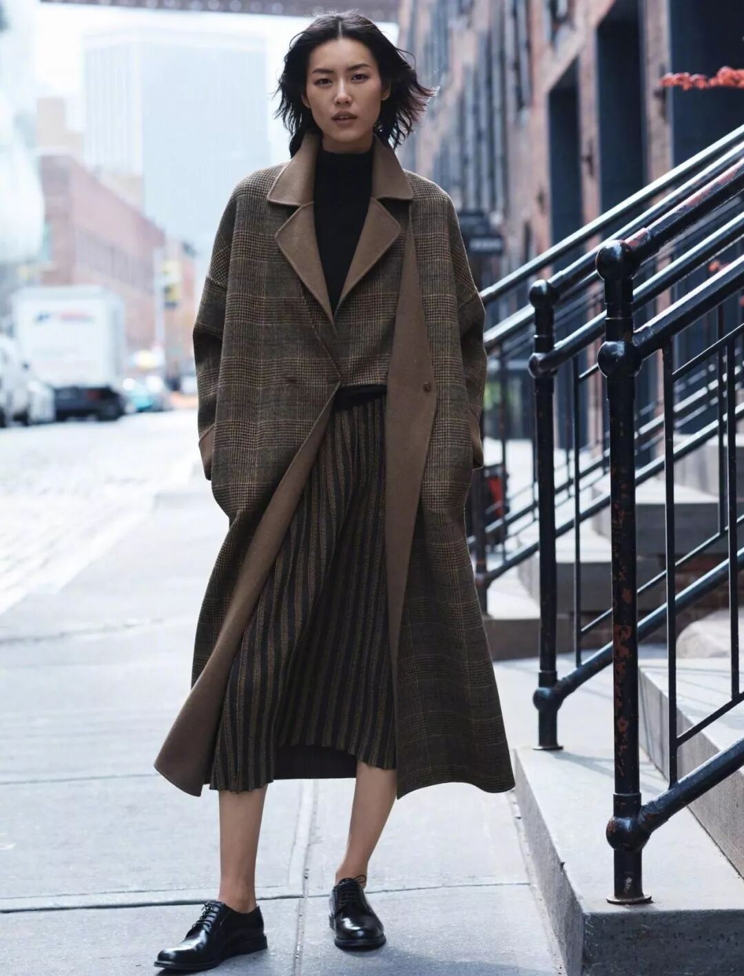 除了裤子,裙子跟牛津鞋也很搭。大表姐刘雯用牛津鞋搭配条纹半裙和格纹大衣,复古感 max,满满的高级感。