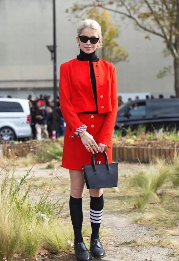 西装式套裙本身比较淑女正式,搭配牛津鞋和长袜秒变俏皮少女。