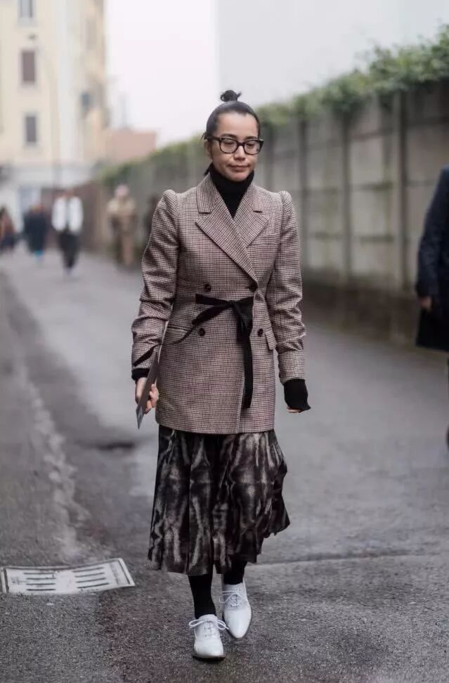 西装+长裙的搭配刚柔并济,牛津鞋则使得整体造型更有质感。