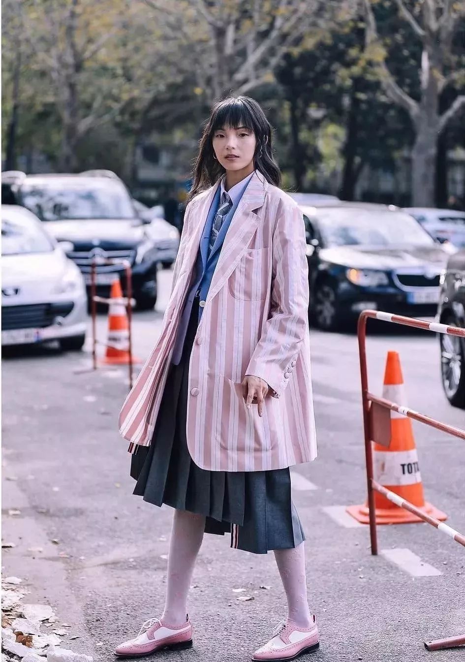雎晓雯的粉白拼接牛津鞋清新少女,正好呼应粉白条纹外套,整体造型前卫又少女,十分吸睛。
