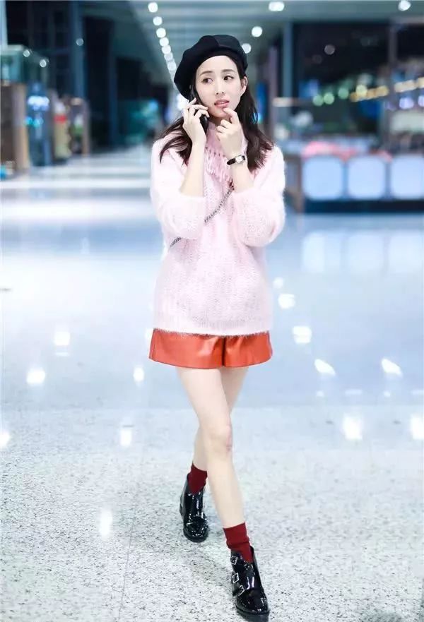 张钧甯身穿粉色毛衣和橘色皮裙,头戴贝雷帽,脚踩牛津鞋,优雅甜美,酒红色短袜又增添了不少俏皮感。